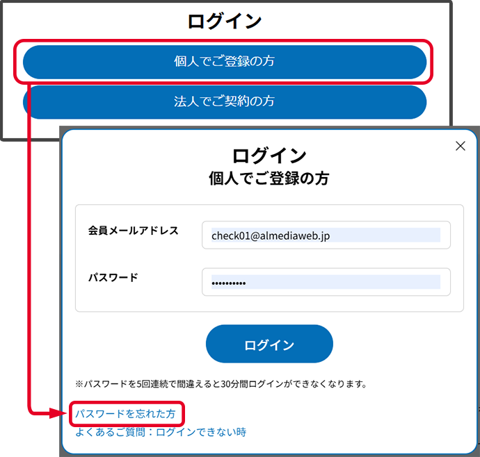 ※パスワードを5回連続で間違えると30分間ログインができなくなります。